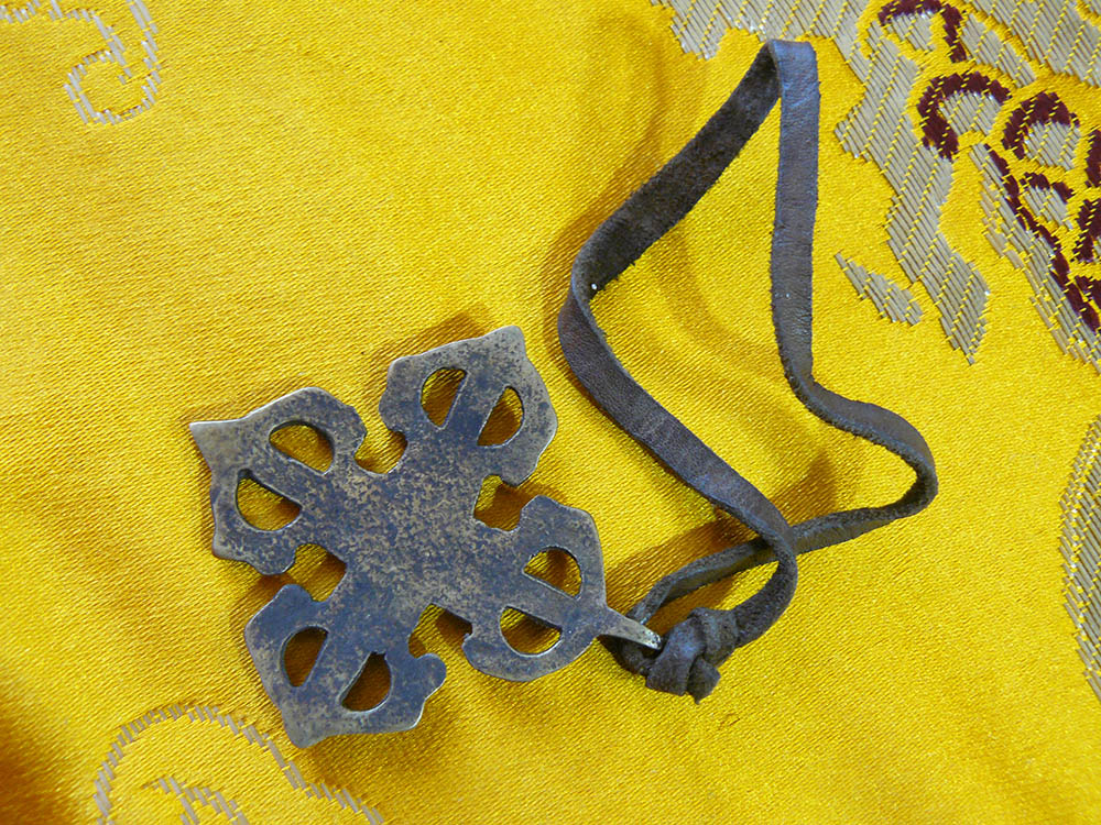 A recently made, white metal knot of eternity. This is a popular design in both Tibetan Buddhism and Mongolian Shamanism.
