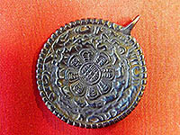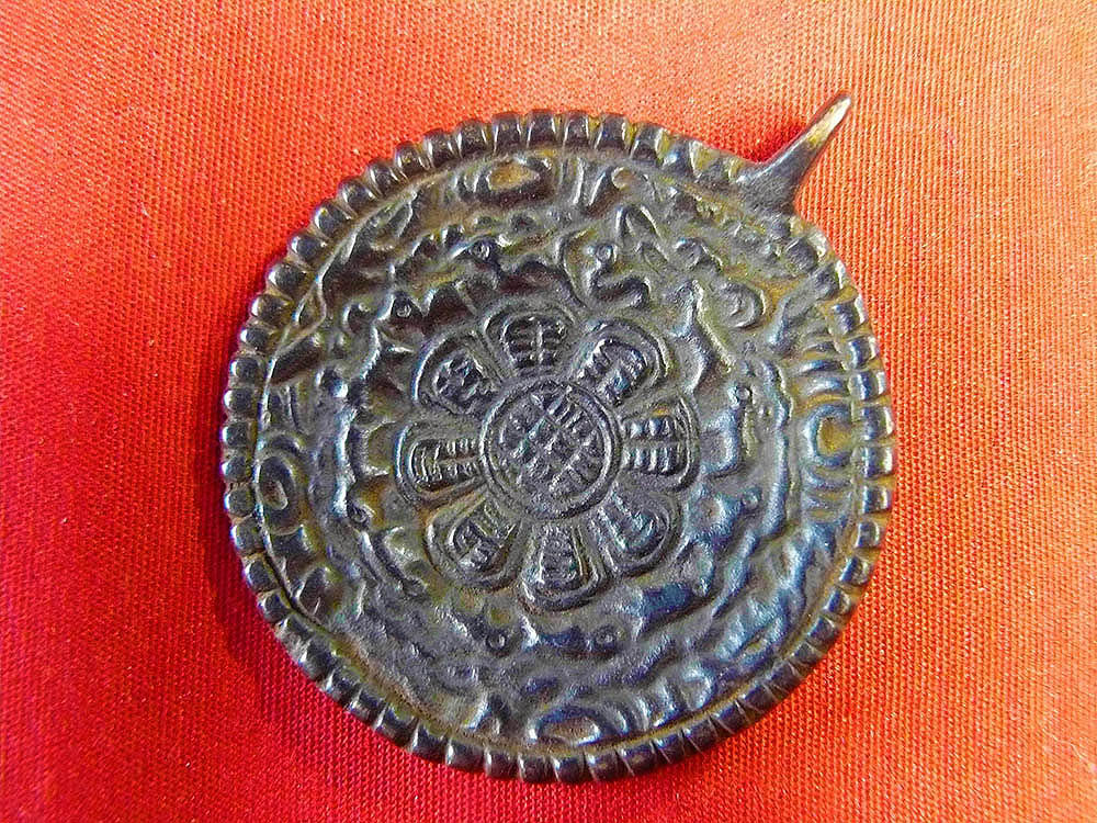 A melong type amulet (Buddhist ritual mirror), with the mantra OM on it.