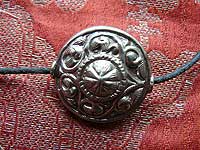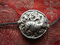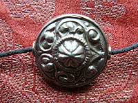 Attractive hand made white metal amulet with a repossee design. It comes on a leather cord to be worn by itself, or it could be added to other amulets or beads.