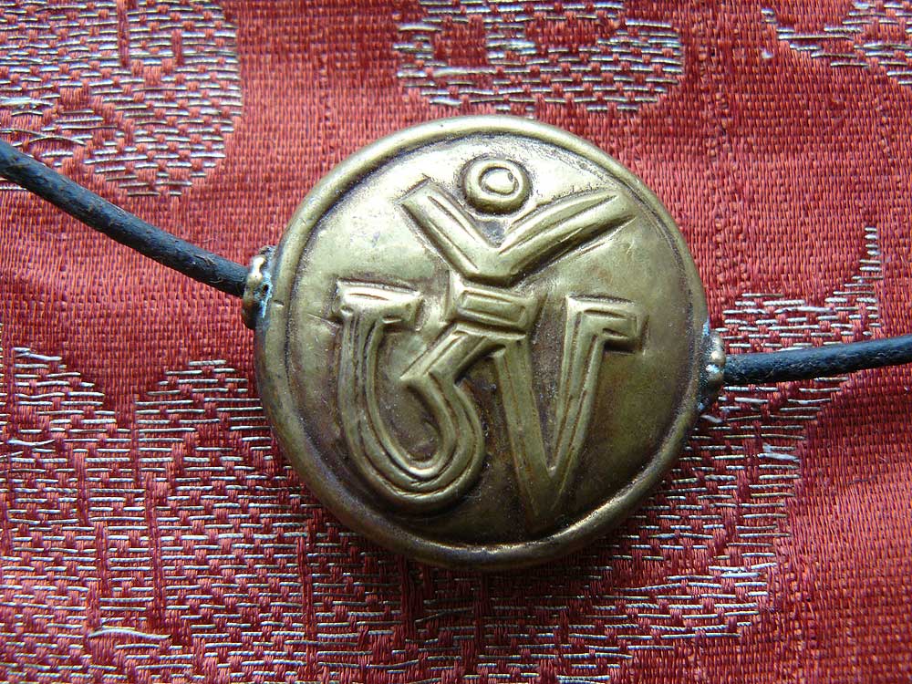 Attractive hand made brass amulet with a repossee OM mantra in Sanskrit script. It comes on a leather cord to be worn by itself, or it could be added to other amulets or beads.
