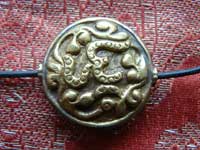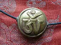Attractive hand made brass amulet with a repossee OM mantra in Tibetan script. It comes on a leather cord to be worn by itself, or it could be added to other amulets or beads.